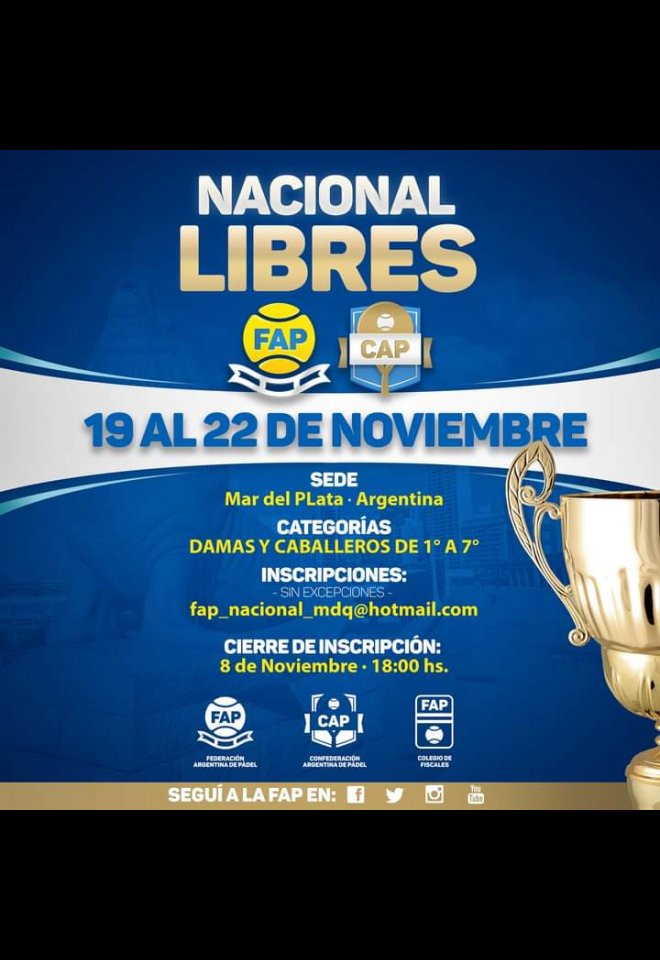 »» Evento: Nacional de Padel Libres »» Localidad: Mar del Plata »» Fechas: 19/11/2021 al 22/11/2021