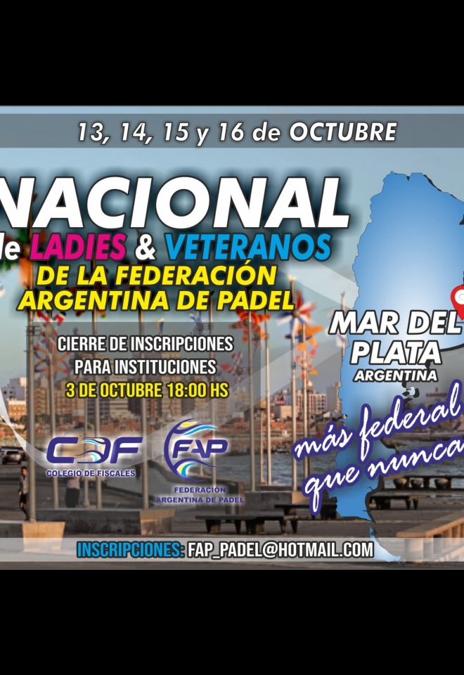 »» Evento: NACIONAL FAP 2023 - Ladies & Veteranos »» Localidad: Mar del Plata »» Fechas: 13/10/2023 al 16/10/2023